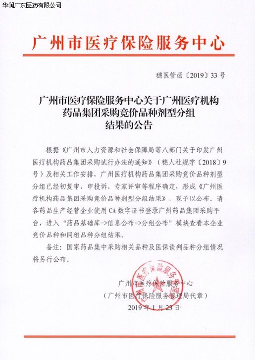 華潤廣東醫(yī)藥有限公司關(guān)于廣州醫(yī)療機構(gòu)藥品集團委托集中議價結(jié)果公布及合同簽訂的通知