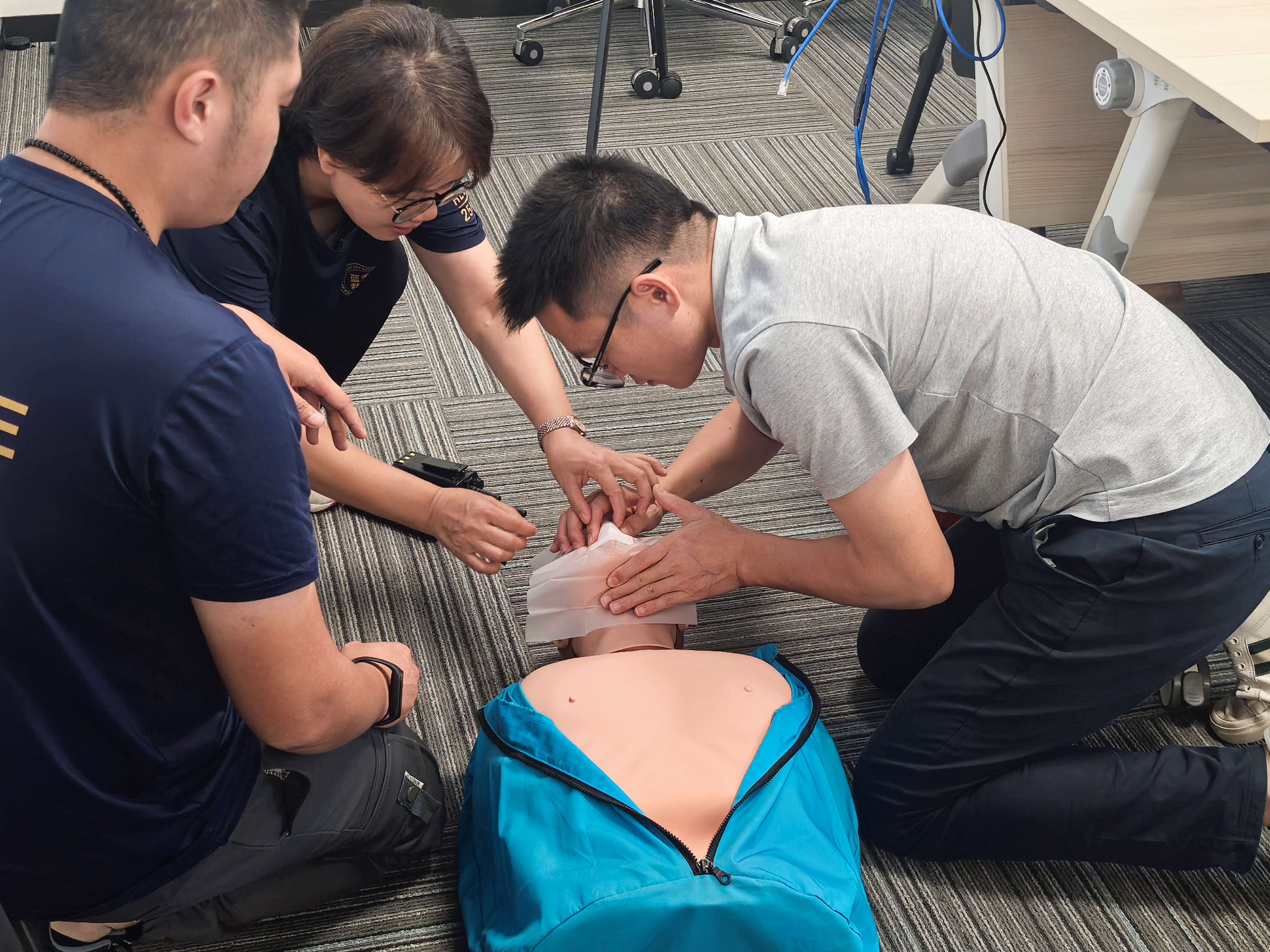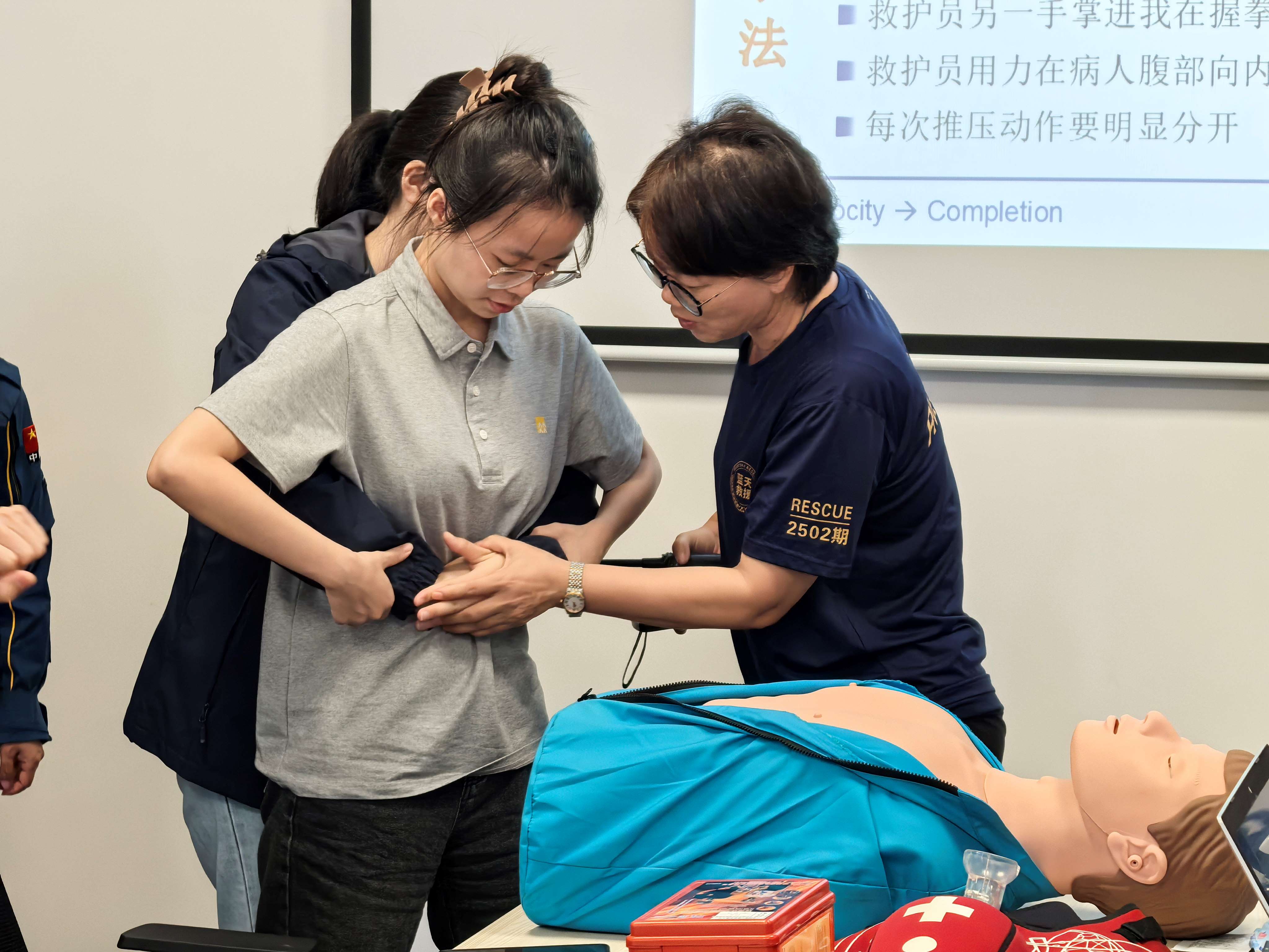 活動伊始,湛江市藍天救援隊的專業講師毛成通過專業知識講授、實際案例分析等形式,圍繞火災逃生、心肺復蘇、海姆立克急救法等重要主題展開培訓。大家在現場實操練習徒手心肺復蘇操作及海姆立克急救法。